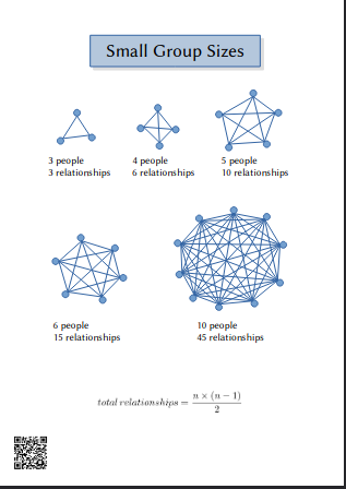 Instructions: This diagram only shows three examples of small group sizes and the corresponding relationships. You can draw any other combinations, or simply use the following formula to calculate how many relationships exist in any size group: