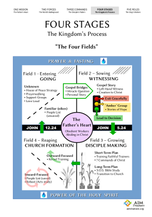 Training Database Four Stages / Four Fields (Diagram) FOUR STAGESThe four stages or "Four Fields" diagram. The seed which is planted, growing to maturity, and harvested, depicts the process of making and multiplying disciples in the Kingdom. Download Instructions: This is a very complex diagram and is best taught in stages, beginnning with a broad overview, then from Field 1 through Field 4. Copy this link to share Four Stages / Four Fields with someone else: Copy Link Alphabetical Listing of Training Elements One Doorstep to a Family 15-Second Testimony 411 Acts 2 Study Acts Pattern Study Allen, Roland - Strategic Points Allen, Roland - Substance of Paul’s Preaching Allen, Roland - The Teaching Are We Disciples of Jesus Christ Balance in the Five-Fold Ministry Banyan Trees and Banana Trees Big Vision Blind Spot Breaking the Rules Church Identity Triangle Church Planting Model Comparison Church Planting Movements (PDF) Coaching Plan Coleman, Robert - The Master's Plan Common Obstacles and Problems of Asian SCs Community Survey Comparing SC Training Models CPM Continuum Creation to Christ Story Creative Problem Solving Dead Sea and Sea of Galilee Designing a Training Plan Disciple-Making and Raising Children Discovery Bible Study - AIM for Believers Discovery Bible Study - AIM for Unbelievers Door-to-Door Preparation Ee-Taow, Part 1 Ee-Taow, Part 2 Eims, Leroy - Biblical Examples Eims, Leroy - Early Church Eims, Leroy - Two Examples Engel's Evangelistic Countdown Forces of Light and Darkness Four Kinds of Disciples Four Stages / Four Fields Four-Step Checklist for Just-in-Time Training Generational Growth Mapping God in My Home, Neighborhood, Workplace Gospel Bridges Gospel Encounters Record Gospel on the Hand Great Commission Partnership Hope in a Broken World Ibraham, Ishtak - Reaching Muslim People Inward & Outward Focus Iron-on-Iron Know - Be - Do Lessons from the Thessalonians Lockridge, SM - My King MAWL McGavran, Donald - Pattern of the Great Century McGavran, Donald - People Movements Models Multiplication Exercise New Life in Christ One Anothers One Mission Parable of the Cornfield Patterson, George - Spontaneous Multiplication Paul's Development - 5 Levels of Leadership Paul's Discipleship Model Paul's Three Journeys Pauline Case Study People in the Harvest (Four Soils) People List People Map (oikos or network) Person of Peace Positive Accountability Prayerwalking Problem Solving Exercise Profile of an Evangelist (SC) in a UPG Quotes & Verses Posters Reboot Richardson, Don - Concept Fulfillment Richardson, Don - Finding the Eye Opener Schindler's List—'I Could Have Done More' Schwartz, Glenn - Dependency Sending Narratives Study Seven Generations Seven Parts of a CPM Plan Simson, Wolfgang - Fathering Simson, Wolfgang - Fivefold Ministry Simson, Wolfgang - House Churches Small Group Sizes Smith, Steve - The T4T Story Stott, John - The Bible in World Evangelization Strategy Coordinator - Old and New Paradigm Strategy Snapshot Summary of the Acts Church Planting Pattern Testimony (Personal Story) The Bold Parts The Complete Package for CPMs The Five-Fold Ministry in the Four Stages The Four Fields and the Great Commission The Great Commission of Abraham The Great Story The Left Side of the Graph The Lorax—'Plant the Seed' The Modeling Sequence in Luke The Peter Pathway The Romans Road The Traffic Light The Word on the Street Three Circles Three Great Commands and AIM Pattern THUMB - Religious Groups Training Faithful Trainers (TFT) Triangle and Square Vision-Casting Vignettes What Is a Strategy Coordinator? Witness Model Zone Witnessing to Catholics Your New Journey