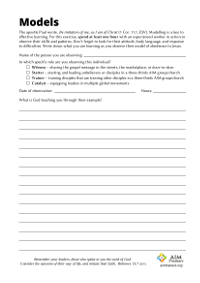 Models 60 minA one-page worksheet for recording what someone is learning from another leader who is modeling a particular aspect of Great Commission work. Download Instructions: Basic instructions are on the sheet. Provide a copy of this worksheet for each encounter the participant has with the person they are observing.Copy this link to share Models with someone else: Copy Link Alphabetical Listing of Training Elements One Doorstep to a Family 15-Second Testimony 411 Acts 2 Study Acts Pattern Study Allen, Roland - Strategic Points Allen, Roland - Substance of Paul’s Preaching Allen, Roland - The Teaching Are We Disciples of Jesus Christ Balance in the Five-Fold Ministry Banyan Trees and Banana Trees Big Vision Blind Spot Breaking the Rules Church Identity Triangle Church Planting Model Comparison Church Planting Movements (PDF) Coaching Plan Coleman, Robert - The Master's Plan Common Obstacles and Problems of Asian SCs Community Survey Comparing SC Training Models CPM Continuum Creation to Christ Story Creative Problem Solving Dead Sea and Sea of Galilee Designing a Training Plan Disciple-Making and Raising Children Discovery Bible Study - AIM for Believers Discovery Bible Study - AIM for Unbelievers Door-to-Door Preparation Ee-Taow, Part 1 Ee-Taow, Part 2 Eims, Leroy - Biblical Examples Eims, Leroy - Early Church Eims, Leroy - Two Examples Engel's Evangelistic Countdown Forces of Light and Darkness Four Kinds of Disciples Four Stages / Four Fields Four-Step Checklist for Just-in-Time Training Generational Growth Mapping God in My Home, Neighborhood, Workplace Gospel Bridges Gospel Encounters Record Gospel on the Hand Great Commission Partnership Hope in a Broken World Ibraham, Ishtak - Reaching Muslim People Inward & Outward Focus Iron-on-Iron Know - Be - Do Lessons from the Thessalonians Lockridge, SM - My King MAWL McGavran, Donald - Pattern of the Great Century McGavran, Donald - People Movements Models Multiplication Exercise New Life in Christ One Anothers One Mission Parable of the Cornfield Patterson, George - Spontaneous Multiplication Paul's Development - 5 Levels of Leadership Paul's Discipleship Model Paul's Three Journeys Pauline Case Study People in the Harvest (Four Soils) People List People Map (oikos or network) Person of Peace Positive Accountability Prayerwalking Problem Solving Exercise Profile of an Evangelist (SC) in a UPG Quotes & Verses Posters Reboot Richardson, Don - Concept Fulfillment Richardson, Don - Finding the Eye Opener Schindler's List—'I Could Have Done More' Schwartz, Glenn - Dependency Sending Narratives Study Seven Generations Seven Parts of a CPM Plan Simson, Wolfgang - Fathering Simson, Wolfgang - Fivefold Ministry Simson, Wolfgang - House Churches Small Group Sizes Smith, Steve - The T4T Story Stott, John - The Bible in World Evangelization Strategy Coordinator - Old and New Paradigm Strategy Snapshot Summary of the Acts Church Planting Pattern Testimony (Personal Story) The Bold Parts The Complete Package for CPMs The Five-Fold Ministry in the Four Stages The Four Fields and the Great Commission The Great Commission of Abraham The Great Story The Left Side of the Graph The Lorax—'Plant the Seed' The Modeling Sequence in Luke The Peter Pathway The Romans Road The Traffic Light The Word on the Street Three Circles Three Great Commands and AIM Pattern THUMB - Religious Groups Training Faithful Trainers (TFT) Triangle and Square Vision-Casting Vignettes What Is a Strategy Coordinator? Witness Model Zone Witnessing to Catholics Your New Journey
